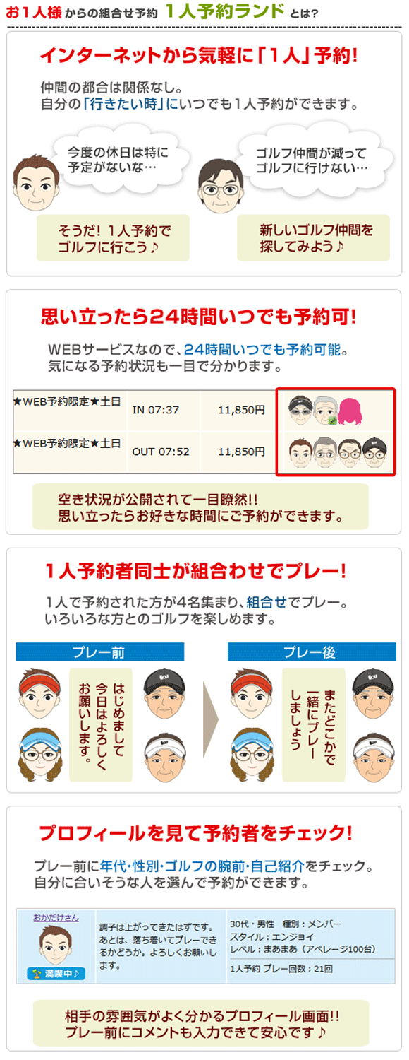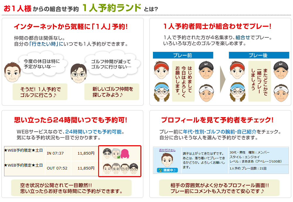 ゴルフのお1人様予約はこちらから!ご予約前に同じ組の方の性別・年齢・腕前などが見れますので安心!予約に関する情報もすべてメールでお知らせします。※ご利用にはWEB会員登録が必要となります。